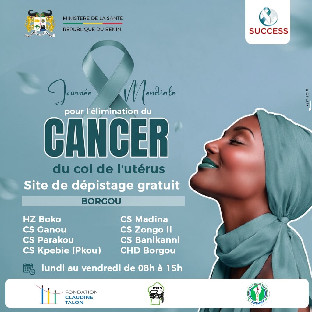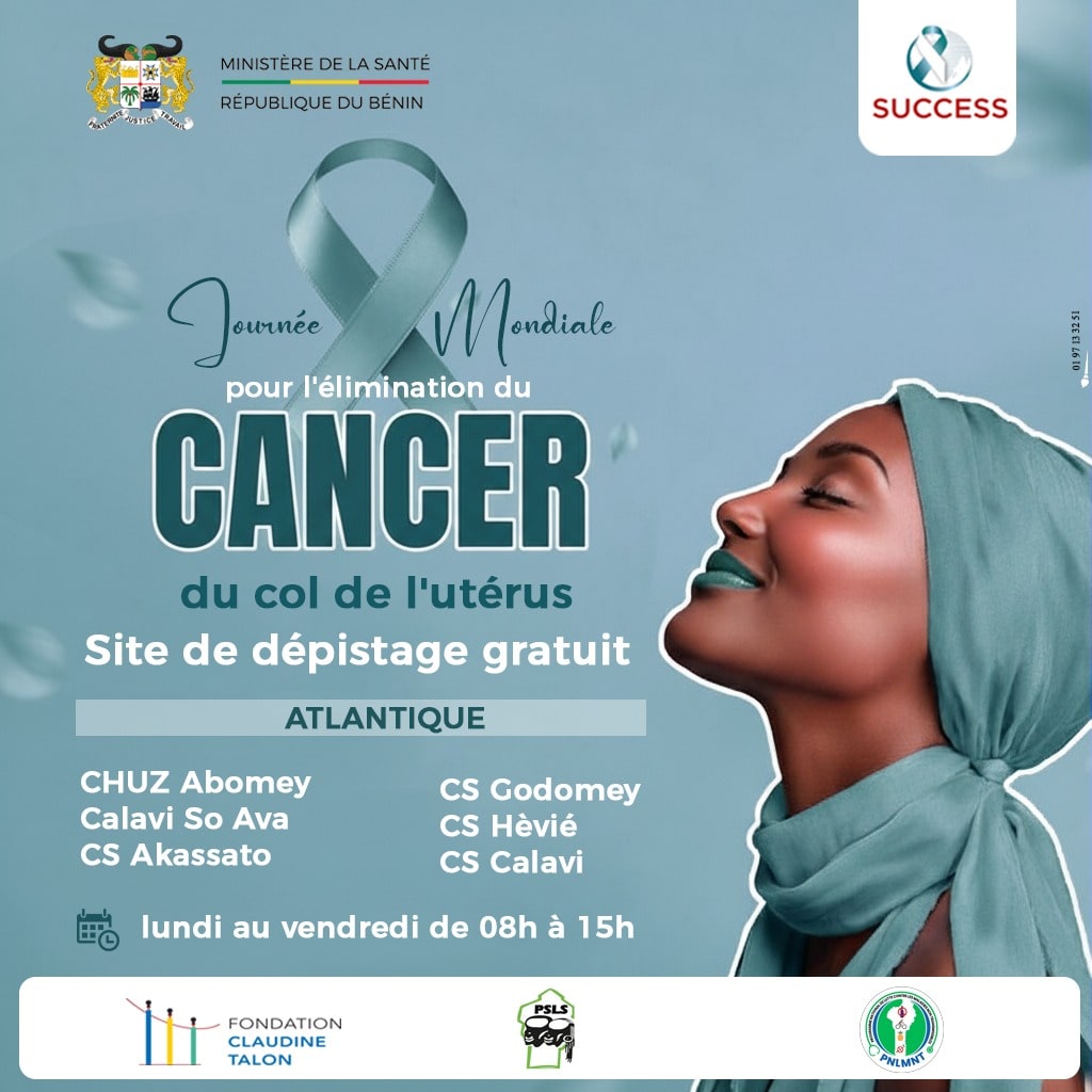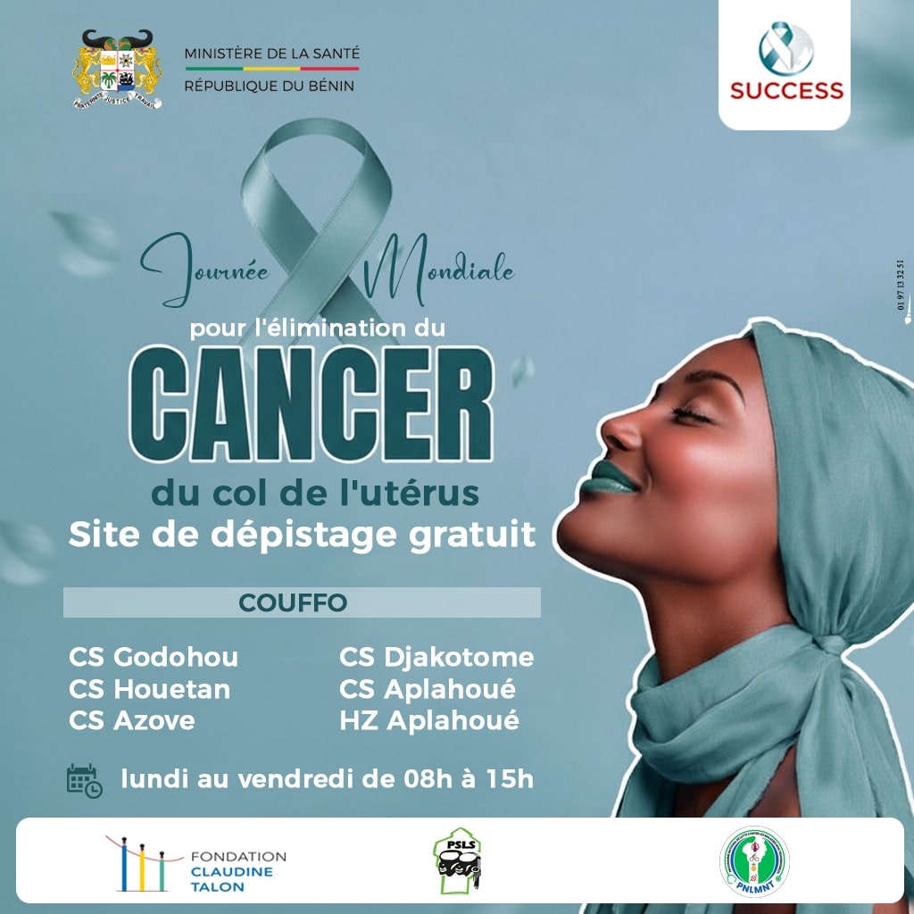 À l’occasion de la Journée d’action pour l’élimination du cancer du col de l’utérus, le Ministère de la Santé encourage toutes les femmes à visiter nos centres de santé notamment les centres du réseau du Projet SUCCESS, mis en œuvre par le Ministère de la Santé avec le soutien d’Expertise France et de la Fondation Claudine TALON pour le dépistage et le traitement des lésions précancéreuses du col de l’utérus dans les départements de l’Atlantique, du Borgou, du Couffo, du Littoral et du Zou.
