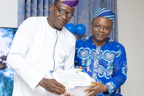 Il a ensuite remercié les membres du comité d'organisation de la cérémonie, notamment Mme Joseline KIKI et M. Cosme Toumé, relayés plus tard par Mmes Justine Dandjinou et Valérie Sessou pour leur dévouement pour la réussite de l'événement. Il a enfin dit son administration à tout le personnel qui a financé sur cotisation la cérémonie et remercié le cabinet Light Innovation qui en a accompagné l'organisation technique.