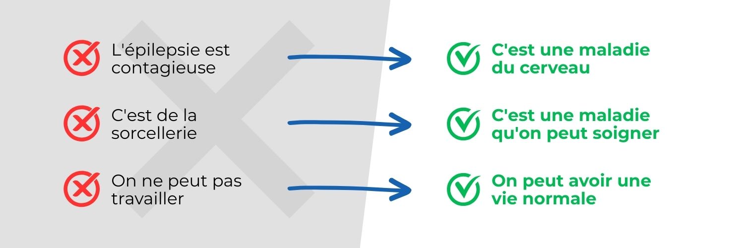 La vérité : L'épilepsie est une maladie du cerveau qu'on peut soigner avec des médicaments. Elle ne se transmet pas d'une personne à l'autre. Ce n'est ni de la sorcellerie ni une punition.